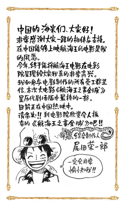 为了实现《航海王》二十年内地大银幕完美首航,此次《航海王之黄金城》,由原漫画作者尾田荣一郎亲自操刀,创作了上万张原画以保证电影的原汁原味,同时还在最新的亲笔手稿中表达了对中国海米们的感谢以及对《航海王之黄金城》的祝福,并称其为“历代剧场版中最棒的一部”,诚意满满,温暖感人。