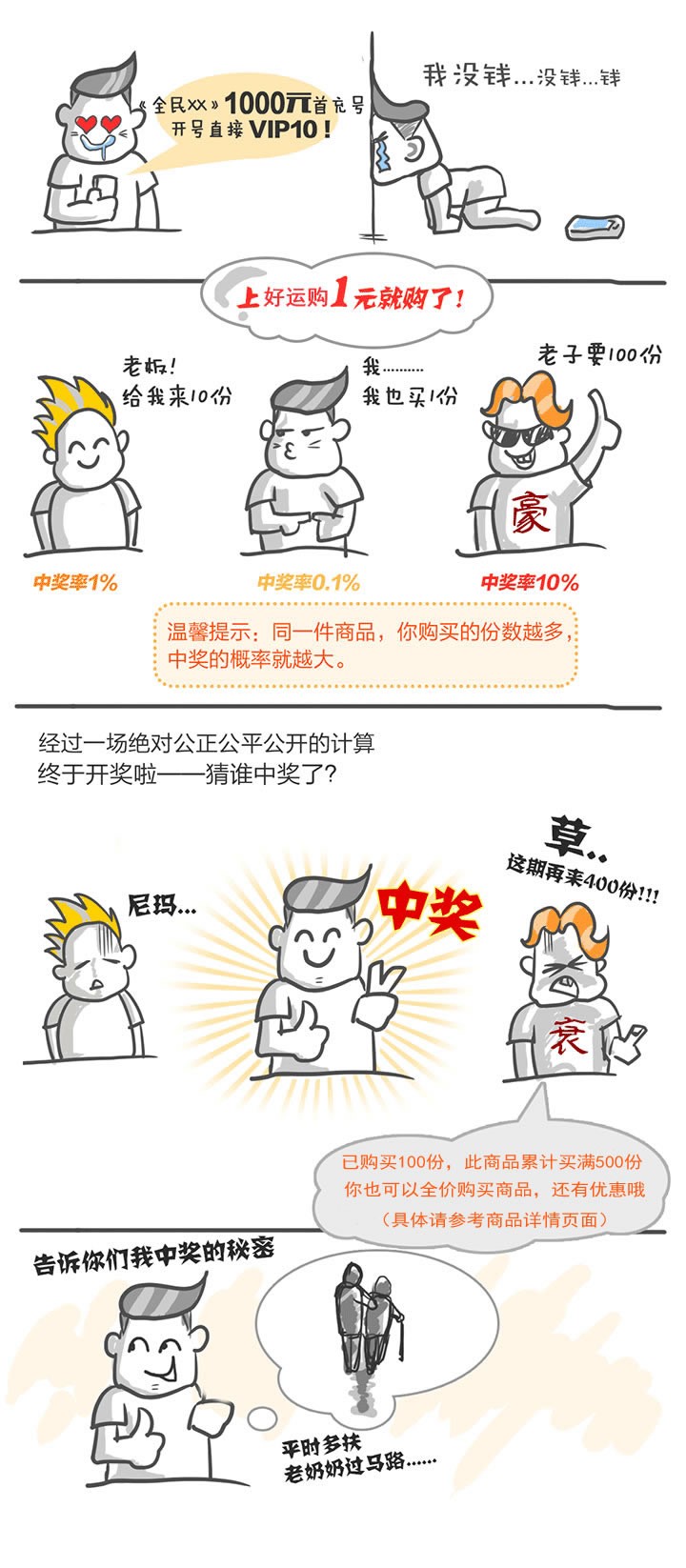 ? ? 好运购采用公平公开公正的中奖计算方式,每位用户所获取的幸运码均为系统随机分配,然后根据科学客观的计算方式计算出获奖者,最后每位用户可以随时查看每件商品的参与人数、参与次数、参与名单及中奖信息等记录,完全公开透明。据介绍,中奖计算方式是这样的: