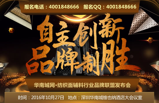 纺织面辅料行业品牌联盟发布会将于2016年10月27日在深圳华南城维也纳酒店召开。本次活动由华南城网主办,届时权威纺织行业协会、优质纺织品牌企业及各大知名媒体将应邀出席。本次品牌联盟发布会以“自主创新、品牌制胜”为主题,深度解析“纺织行业+互联网”的创新发展模式,率先组建纺织面辅料行业品牌联盟,引领企业夯实品牌、赢得市场。