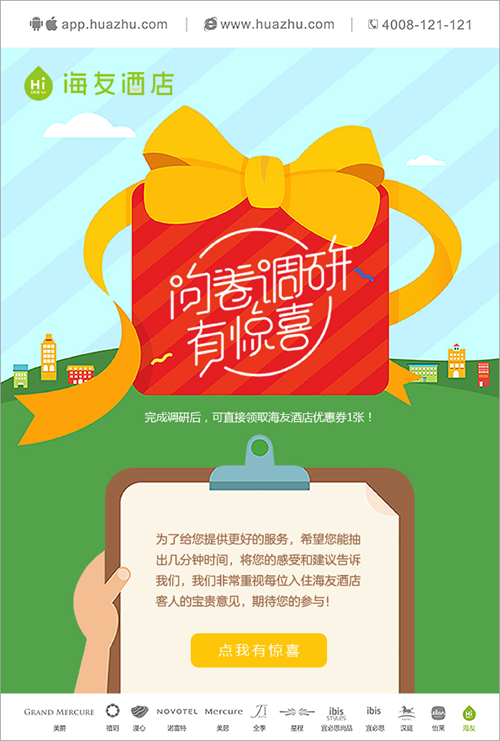 本次调研自10月10日上线到11月9日截止,调研范围涵盖全国330余家门店,此外,该活动还在华住APP、华住官方微信、海友官方微信及微博、EDM等线上渠道全方位推广。活动期间,所有到店消费的宾客均可参与调研,通过扫码进入H5页面完成问卷,提交有效问卷的宾客便可获得海友酒店优惠券,获奖概率达100%。