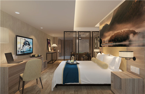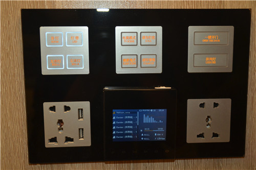 打开房门,即刻传来音乐欢迎提示。进入房间后,记者通过触控按键分别尝试了睡眠、电视、阅读、休闲等多种模式。做出选择的一刹那,灯光、空调等房间设施联动调整,营造最合适的环境。除了触控按键,记者也通过手机尝试了各种模式的切换,操作过程也非常流畅。通过蓝牙,记者将手机里的音乐传输到房间背景音乐,整个房间瞬间充盈着曼妙的音乐。