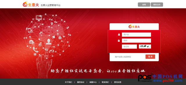 科技感十足的登陆页面,不仅简洁大方,深红色的底色给人庄重、严谨的感觉。此外,登录界面下端的一句“助商户轻松实现电子商务,让O2O轻松落地”体现着生意火平台的专业性。