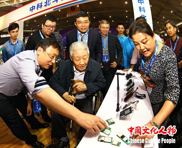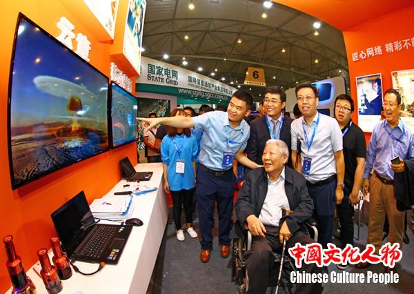 孙家栋院士在展台前饶有兴致地听取展位工作人员的介绍,并鼓励参展单位要坚定不移实施创新驱动发展战略