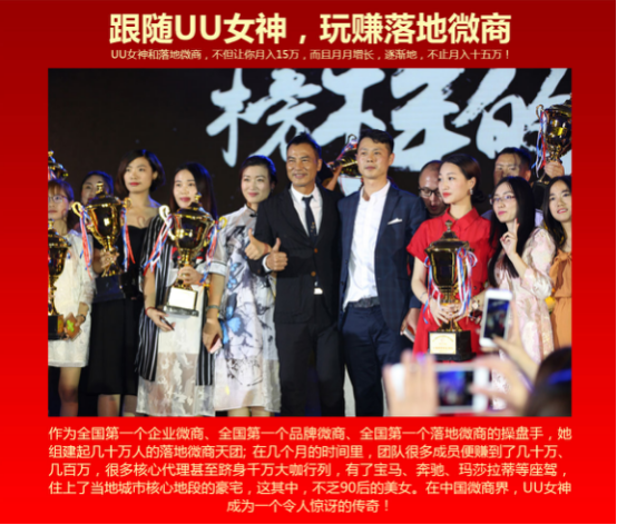 2015年初:UU创立了落地微商营销新模式。以“大品牌+落地微商”的战略开拓大健康产业蓝海,被誉为“UU女神”。
