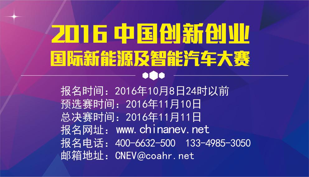 ?新能源业界大咖评审,技术推广企业对接,百亿创业基金支持,2016《中国创新创业新能源及智能汽车大赛》招募报名正式开始(报名入口:www.chinanev.net中国新能源汽车网官方网站),参赛者只需带上您的新能源汽车相关项目或技术参赛,就有机会赢取百万奖金,并让您的项目或技术在应用平台展示,同时我们帮助您对接市场资源,对接政策、对接资本、对接创业伙伴,促进技术项目与整车厂、零部件企业等的深入对接与合作。
