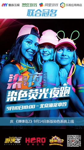 两千人狂欢大Party,最潮Runner High翻北京!为庆祝《弹弹岛2》9.14染色系统上线,由魅族互娱、360游戏中心、阿里游戏、乐视应用商店联合冠名赞助,英雄互娱携手游侠客主办的“染·夜 Run Night”荧光夜跑活动于上周六(9月10日)晚6点在北京海淀中坞妖娆开跑!