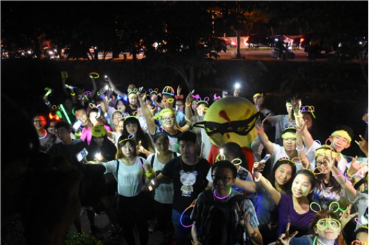 在活动现场,每个人利用荧光装备随性装扮,与其他人盛装出席,进行无排名之分,无速度之争的运动,这是一场夜色与荧光的狂欢。搞怪的帅哥,卖萌的妹子,每个人都一改自己往日的形象,随心所欲的任意发挥,打扮出最独一无二的自己。