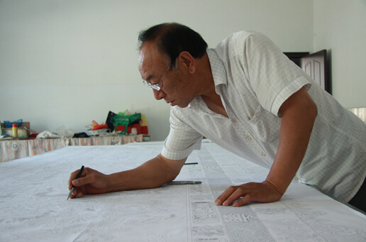 ?第一位出来迎接的就是这家的主人,民间剪纸艺术大师周河先生,他笑容可掬,待人谦和,身材魁梧,展示出一种艺术家的气息风尚。周河先生是蔚县剪纸艺术传承人之一,出生在剪纸世家,受父辈影响,从小就爱好剪纸,高中毕业后便全身心的投入了剪纸艺术,经过几十年的刻苦钻研和努力,使剪纸艺术这个非文化遗产归宝得到了更好的传承和弘扬。因此周河先生也获得了成功及更多荣誊,他的作品得到更多人的认可喜欢及欣赏。近年来作品已受到国内外剪纸爱好者的青睐和收藏,同时也得到国家相关部门的公认重视。有的作品《巨龙图》已悬挂在人民大会堂并收藏,《九州山川实证揔图》上海世界博览会收藏,《嫦娥奔月》被北京天文台收藏,《中华和谐图》也被首届华人运动会作为精品展出。1999年《巨龙图》荣获“昆明世博会”剪纸大师称号并获金奖,国家专利局颁发了剪纸外观设计专利证书。2002年9月获“华夏风韵剪纸艺术展”金奖。