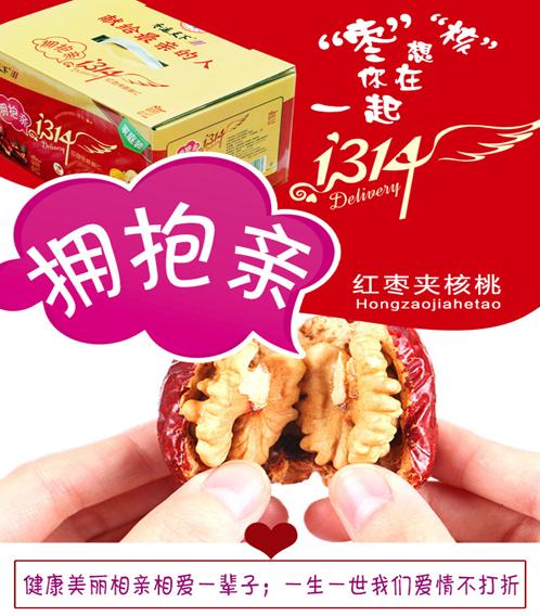 而目前,最火爆的红枣产品就是六郎枣业商城“枣通天下”所销售的“拥抱亲1314红枣夹核桃”(https://www.llzttx.com/ods.php?id=66)。从名称上看,“拥抱亲1314”有着拥抱亲一生一世的寓意;从外形上看,枣夹核桃像是拥抱在一起的情侣;从味道上品,核桃的醇香与红枣的香甜搭配在一起,让人回味无穷。且营养价值极高,还具有美容养生等功效,自然受到了广大情侣的热捧。