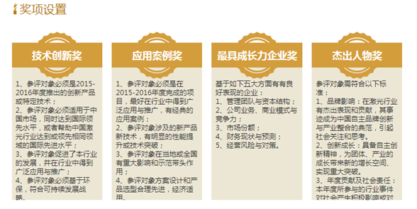 活动旨在表彰激光行业具有突出贡献的优秀产品、技术及企业、人物,鼓励更多企业投入技术创新,同时为行业输送更多创新产品、前沿技术;以提高生产力、经济效益;给用户提供更大便利;引导行业良性快速发展。活动以其公正、客观的评选流程倍受业界广泛关注,已成为中国高科技领域最具专业性、影响力和代表性的行业评选!“OFweek Laser Awards 2016”分设四大奖项,技术创新奖、应用案例奖、最具成长力企业奖、杰出人物奖。由业界申报或者评委提名,通过用户投票和专家评选,最终评出,并将在9月7日举行颁奖典礼。