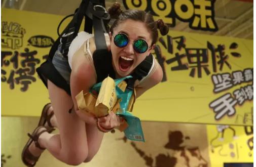 除了致敬,现场的“坚果飞身侠”才是人群焦点,不仅带人“飞”,每一个活动参与者都能免费带走免费带走自己抓取上来的零食,说是嗨爆全场也不为过。
