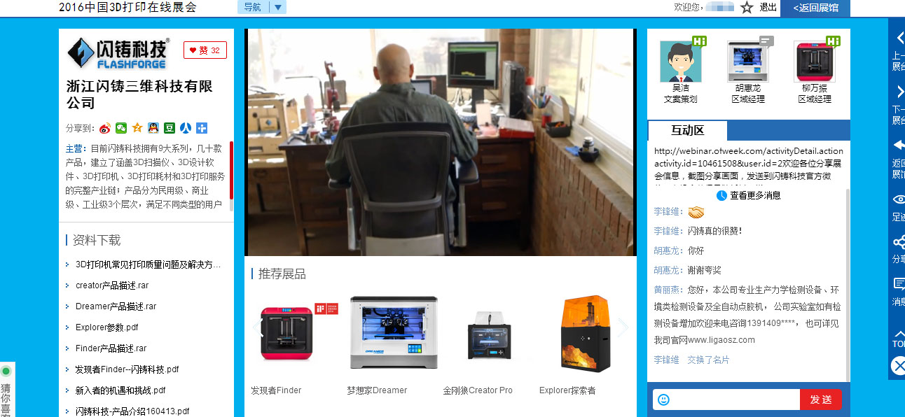 “2016中国3D打印在线展会”为参展企业分别打造了个性化独立展区,通过文字、视频、直播、白皮书下载、产品试用、有奖问答、企业名片互换等多种形式,为企业提供了全方位的形象及产品展示平台。现场观众可自由进入参展商展区,就最关心的问题与主办方一对一交流,构建合作关系。