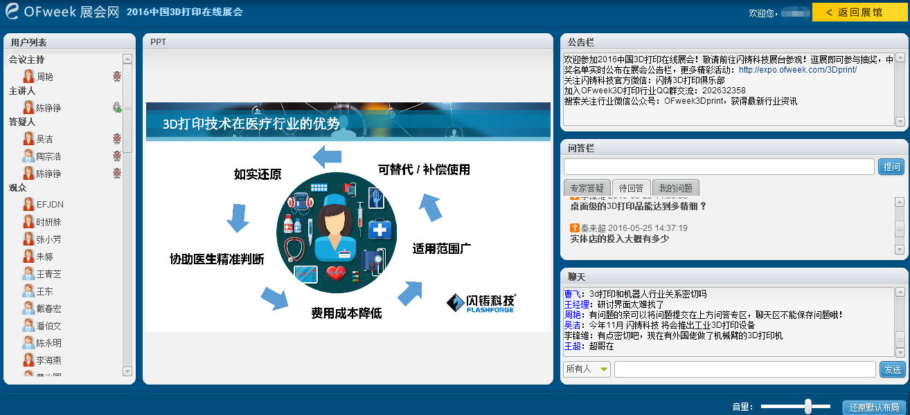 今日,“2016中国3D打印在线展”为行业带来了一场全新的“互联网+”新体验,展会现场反馈积极,气氛热烈。5月26日,本次在线展会还将持续一天,赶紧报名参加吧!http://expo.ofweek.com/3Dprint/Replay/267.html