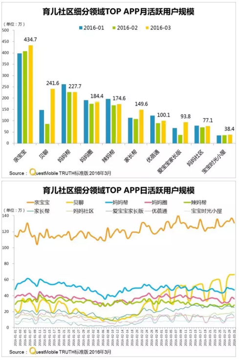 报告数据显示,2016年3月,在育儿社区领域APP中,亲宝宝日活、月活均排在首位。开年以来,亲宝宝前三月活跃用户数表现稳步上升,MAU3月达到近450万人,第二名贝聊241.59万人,妈妈帮在月活数据表现上以227.71万人超过妈妈圈的184.37万人位居第三。