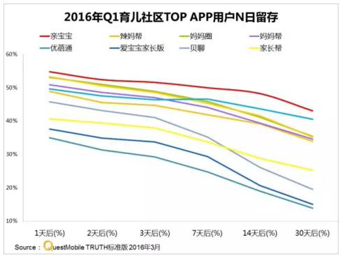 值得注意的是,2016年一季度,亲宝宝、贝聊、宝宝时光小屋和妈妈帮在新安装率的表现上,均超过50%,但从留存数据上来看,安装率排第二的贝聊几乎是直线下滑,而第一的亲宝宝则表现稳定,用户留存率在育儿社区中也是最高,3天后的用户留存仍能达到45%以上。