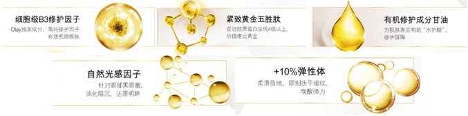 OLAY为美从不妥协,采用4大严苛标准:最佳吸收、精准起效、黄金配比、愉悦肤感,层层严筛全球范围超过25,000余种护肤成分,最终汇聚OLAY独有精萃?细胞级B3修护因子、紧致黄金五胜肽、自然光感因子、有机修护成分甘油、弹性微球等明星成分,精选顶尖1%成分融入配方!