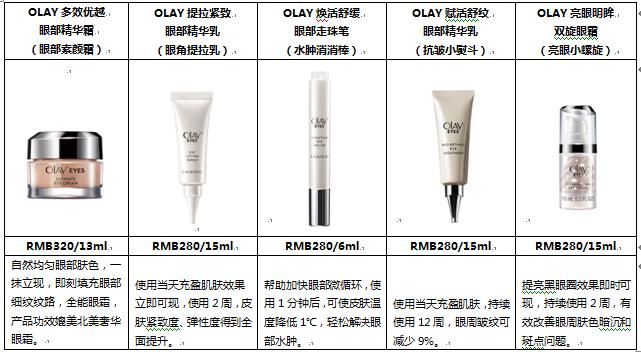 OLAY全新明星眼部护理系列共5款产品,除明星产品OLAY多效优越眼部精华霜一瓶对抗5大问题外,还有OLAY提拉紧致眼部精华乳、OLAY焕活舒缓眼部走珠笔、OLAY赋活舒纹眼部精华乳、OLAY亮眼明眸双旋眼霜分别帮助修护眼部松弛眼底纹、眼部浮肿泡泡眼、眼角纹、黑眼圈4大眼部问题。