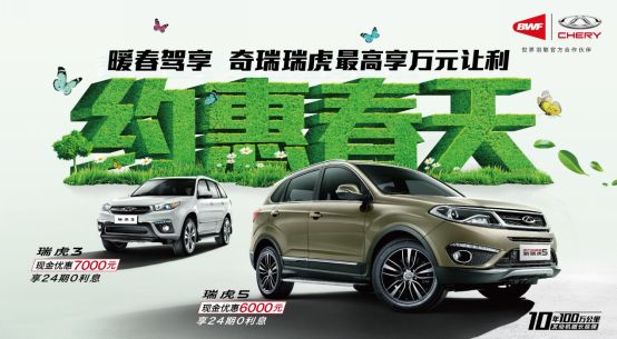 综合优惠超过万元,还有超值延保大礼解除后顾之忧,春意不等人,您还在犹豫什么?赶快致电奇瑞客服热线4008838888,或咨询当地经销商,了解奇瑞“约惠春天 暖春驾享”活动的更多详情。