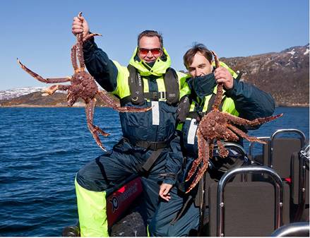 您还将前往帝王蟹的家乡希尔克内斯。乘雪地摩托前往帝王蟹捕捉地点,亲自捕捞重量可达15公斤的帝王蟹,随后享用取材于最新鲜帝王蟹烹制的极鲜美味。