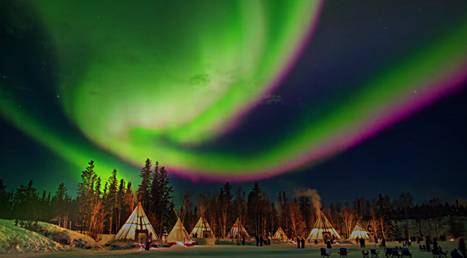 除了极光频繁到访的北欧地区,位于“极光环带”的加拿大北部地区也成为了观赏北极光的圣地。尤其是距离北极圈不足200公里的黄刀镇,被誉为“全球最佳极光观赏地”之一。相比北欧的芬兰和挪威,黄刀以地势平坦著称,因此观赏极光没有遮挡、位置极佳。这里更因为全年250多天都出现极光、观测率高达90%以上而闻名。