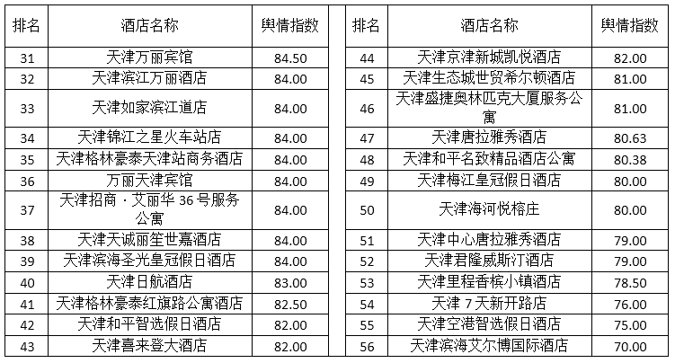 从迈点区域酒店舆情指数监测数据看,9月天津56家酒店平均舆情指数为85.57,,较8月环比上升0.44%。其中,上升最快的酒店是天津第一饭店,本月排名第10,上升31名;下降最快的酒店是天津里程香槟小镇酒店,从上月第22跌至本月53名,下降31名。