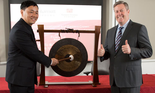 东呈酒店集团创始人、董事长兼首席执行官程新华 (左)与万豪国际集团亚太区总裁兼董事总经理施康瑞(右)敲响铜锣预示双方合作正式展开