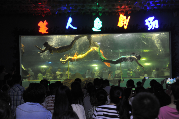 通常情况下,每日有4场美人鱼表演,3名扮演美人鱼的少女,姿态曼妙人鲨互动。另外,特为小朋友推出与海龟互动的环节,同样也是全天4个开放时间。两者集中在每天11点、13点、15点、17点前后表演,大小黄金周节假日每天各表演8场。