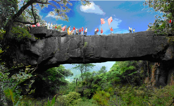天下第一桥,一块天然石板,四十余米横二座山峰,慰为壮观。相传每年的七夕牛郎织女在桥上相会。又名爱情桥。此桥传奇已拍摄成《仙履奇缘》电视片。(普乐)