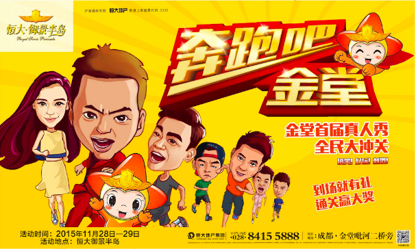 从广州恒大领跑中国足球到恒大地产销售业绩领跑房地产开发商,恒大一直在努力做更优秀的自己。这个暖冬,在金堂,恒大御景半岛也将拉开一场特别的领跑,恒大御景半岛首届大型真人秀主题竞技赛“奔跑吧,金堂”即将于2015年11月28、29日开跑,轻松搞笑、坚毅睿智的娱乐游戏全面开启,恒大御景半岛将带领金堂人民全面开跑。