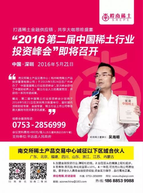 第二届中国稀土行业投资峰会将在深圳举办,届时众多稀土行业投资大咖将齐聚深圳,探讨供给侧改革机遇下稀土投资的机会。