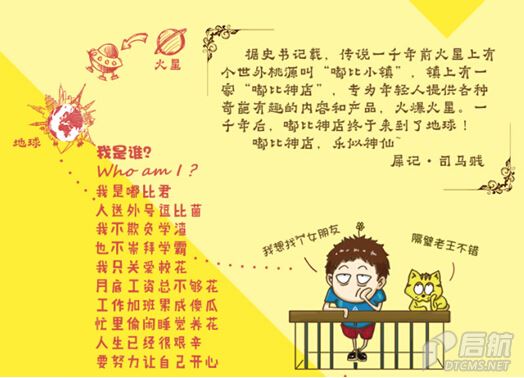嘟比神店,声称来自火星。赋予品牌有趣的品牌故事,只是个开始。80/90后,做有个性的自己。嘟比神店的卡通人物“嘟比君”和他的猫“嘟比贱猫”就是被塑造成够个性够逗比的形象。