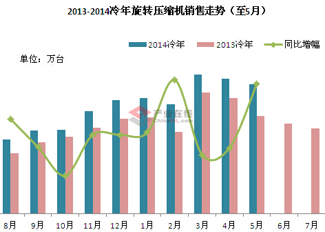 ??? 制冷快报讯:据产业在线统计数据显示,2014年5月旋转压缩机销售1469.5万台,同比增长32.76%;冷年销量为1.23亿台,同比增长20.62%。主要是5月正值传统销售旺季,加之5月下旬高温侵袭,下游空调市场销售火爆,受此带动压缩机销量也开始大幅上扬。