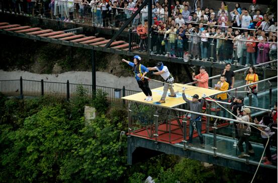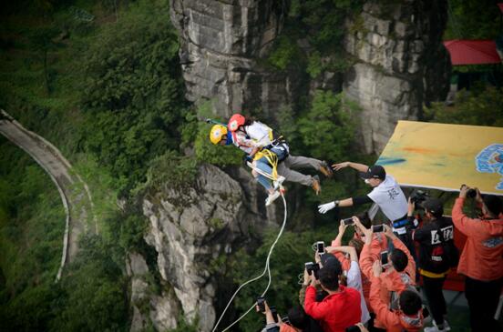 有着中国蹦极第一人之称的极限老段是这个活动的现场负责人,他也是国内极限荡绳跳跃项目的首创者。他告诉记者,高空荡绳要想刺激好玩,最重要的就是高度和荡幅。奥陶纪荣获吉尼斯世界纪录的天空悬廊项目,距离谷底高度达300多米,可以给予体验者最佳的下坠体验,而其破吉尼斯世界纪录的近70米悬挑长度,又可以让荡绳拥有长达上百米的荡弧,让体验者的水平方向摆放时间更长、体验更刺激。