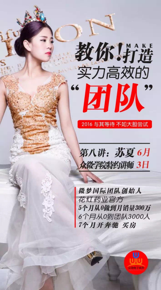 苏夏大学还没毕业就开始微商创业,做过爆款,收入也在四五万左右,后来微商遇到了瓶颈,产品开始积压,代理流失,直到半年前遇到了花红,结识了上市CEO亿万富翁许华建,众微有着完美的培训体系,大咖集训营,产品集训营,经营分享群,魔鬼集训营,这让她迅速成长,三个月内做到了官方,拥有了500人的直属代理,月销量1200箱,销售额超过两百万!(苏夏微信号:RRJ_320)