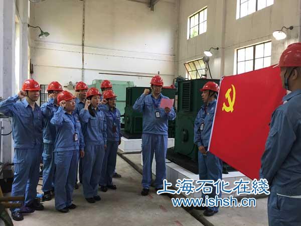 近日来,中国石化上海石化股份公司各基层党组织纷纷开展纪念“七一”暨建党97周年主题党日活动,各党支部组织党员在党员责任区、党员示范岗集中宣誓,以此对党员开展生动的党性教育,进一步号召党员用自己的模范行动践行责任与担当。图为上海石化储运部科室第二党支部党员在党员责任区宣誓。(上海石化在线? 杨梅)?