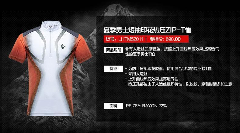 ????这款KOLON SPORT夏季男士短袖印花热压ZIPT恤,采用了PE 78% RAYON 22%的组合式面料,更适合新一代人对T恤衫的要求,宽松的版型适宜进行郊游、野营、登山、徒步行走等户外活动,立起的领型更有利于遮挡紫外线,素色的图片在野外更不容易吸热,上升曲线热压的效果更有利于散热。