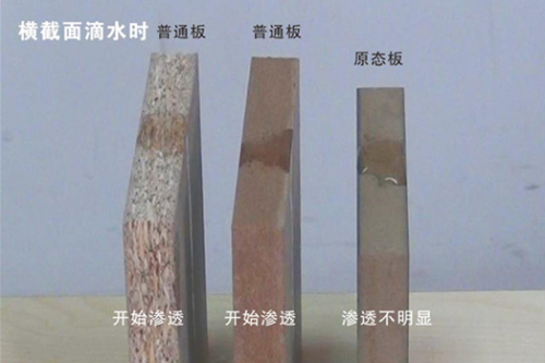 实验过程中(特别是将水滴在横截面上),普通中纤板和颗粒板的水会慢慢渗透进去,原态板无明显变化;