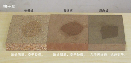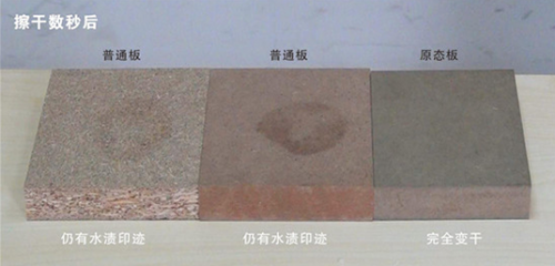 用纸巾擦拭后,原态板挥发速度较快,瞬间即干,恢复原样;普通中纤板和颗粒板逐渐变干,但时间较长,因为普通中纤板和颗粒板已经渗水进去,挥发就慢了。