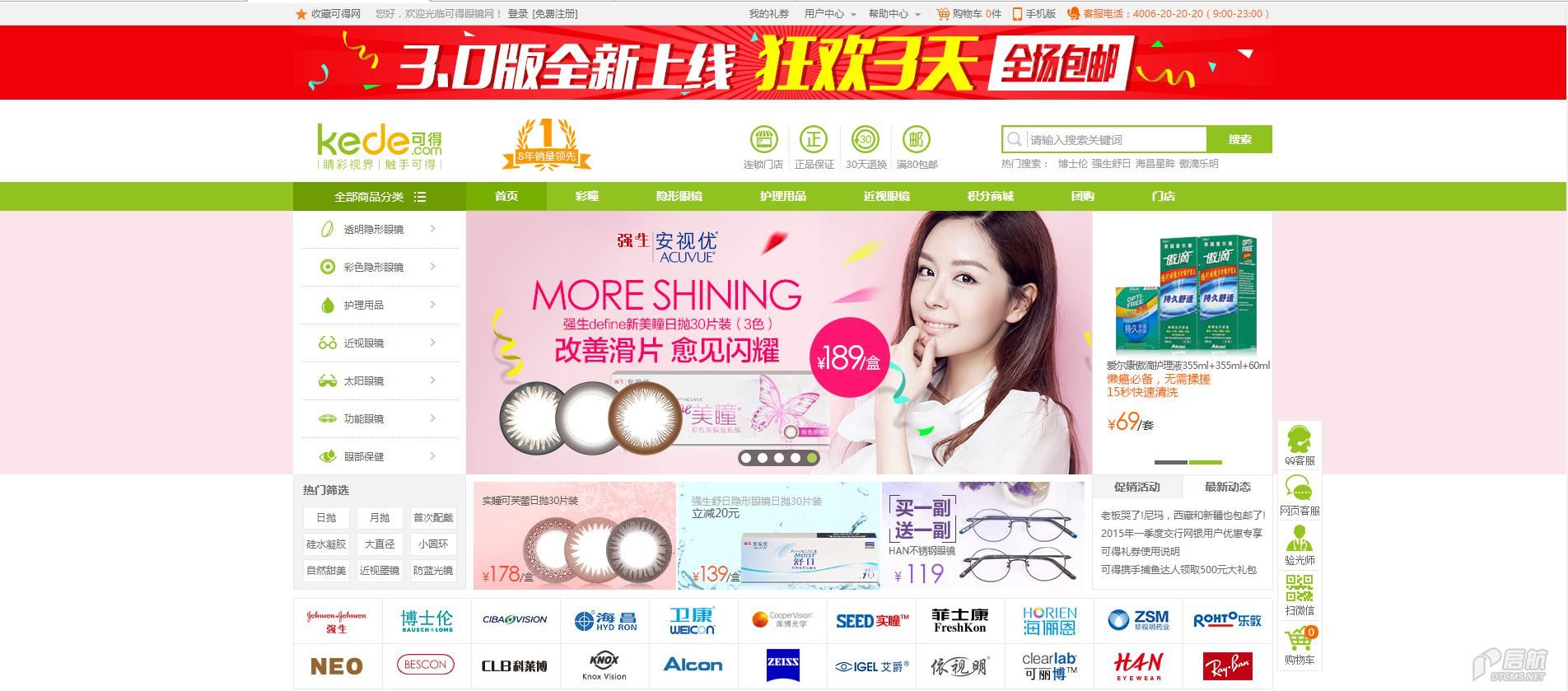 ? ? ? ?最近国内知名眼镜电商平台可得眼镜网进行了全新改版。在域名、Lo和排版格式上都做了优化处理。据调查发现,消费者对这次可得眼镜网的改版普遍看好,认为不仅从视觉上更加的舒适、重点更强,而且极大的简化了购物流程,用户体验有了极大的提高。3.0版全新上线,狂欢三天,全场包邮!