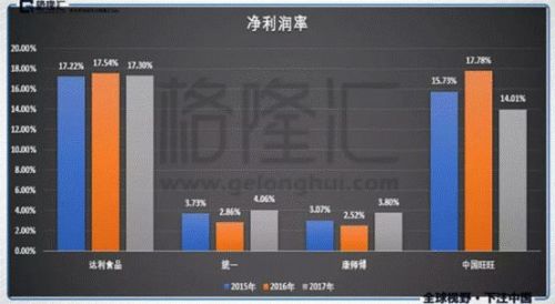 不仅业绩亮眼,达利集团的盈利能力更吸睛,上文中我们也提到了,6年的时间翻了近5倍。在2013年时候,达利反超统一,2015年再超康师傅,2016年的时候已经接近中国旺旺了;并且,近几年来,旺旺、统一以及康师傅的净利润都呈现出逐年下滑的趋势,唯独达利是稳步提升的。近三年的净利润率,达利食品保持在17%以上,远高于同行业的康师傅以及统一的3.8%和4.06%,赚钱、吸金能力大幅领先,真可谓是一个低调的巨头。