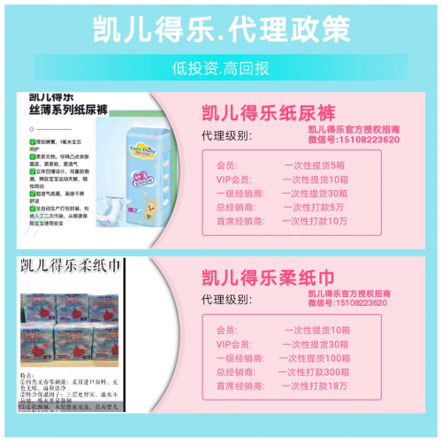 从图中可以看出,加盟凯儿得乐目前有两条途径。一是代理凯儿得乐纸尿裤,另一个是代理凯儿得乐柔纸巾。两条加盟途径所享受的权限都是相同的,大家可以选择适合自己的途径加入。加盟凯儿得乐优势:1.低投资,大回报。从我们的代理价格表可以看出,加入凯儿得乐最低只需要1500元,相当于宝宝35个月纸尿裤的用量,宝宝一年纸尿裤的用量保守估计都是10箱,所以对于家里有宝宝的投资者来说,加盟凯儿得乐算得上是0投资,就算是一包不卖,自己宝宝也能用完。可谓是0风险。
