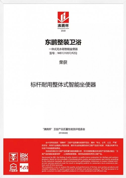 东鹏整装卫浴超光盾系列W8131一体式无水箱智能坐便器(型号:W813105T/FZQ),凭借出众的性能和品质,在“沸腾杯”智能坐便器质量性能测评活动中脱颖而出,荣获“标杆耐用整体式智能坐便器奖”。