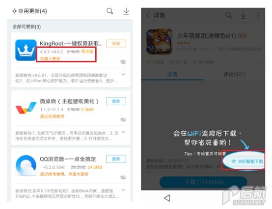图2:应用宝“零流量更新”、“wifi智能下载”流量一省到底