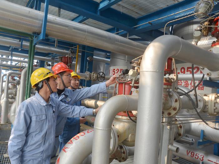 图为塑料厂职工正在检查尾气回收情况