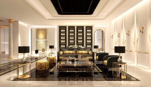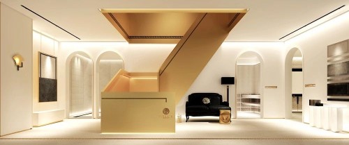 在空间布局上,正如同设计师设计的初衷“向VERSACE致敬”,通过主入口进入前区空间,在灯光的营造下,一幅秉持品牌文化的雕刻作品——“美杜莎头像”处于视线焦点处。接待台金色覆面,金色线条的细节设计使之不过于庄重且时尚。