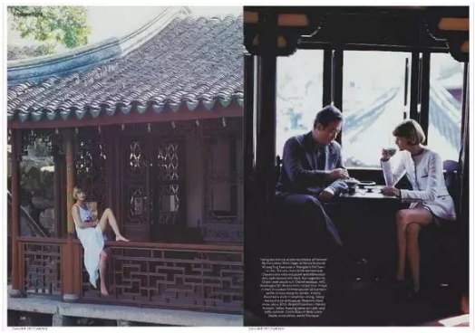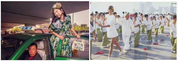 1993年12月刊美版《VOGUE》中国拍摄的女主角是第一个被称为“超级模特”的琳达·伊万格丽斯塔。图为琳达与中国广场舞大爷共舞以及琳达牵着中国小男孩。(彩蛋:这个小男孩简直和宋民国一模一样!)