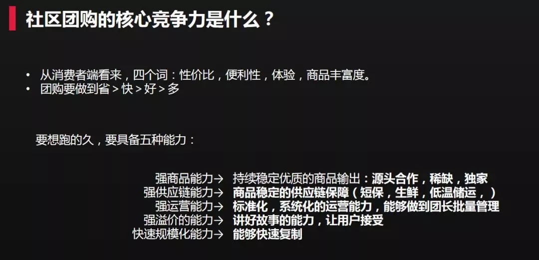 大家都说运营体系,我来看整个核心竞争力只有一个就是商品,没别的,所谓其他一切都是围绕着商品来做的服务,你的供应链组织,团长对用户的运营都是虚的,就是商品,什么商品?叫做精品商品,不是菜市场的商品,是全球顶级好货,供应链高效组织,迅速到达社区消费者手里,能不能把顶级的商品用合适的价格卖给消费者才是关键。