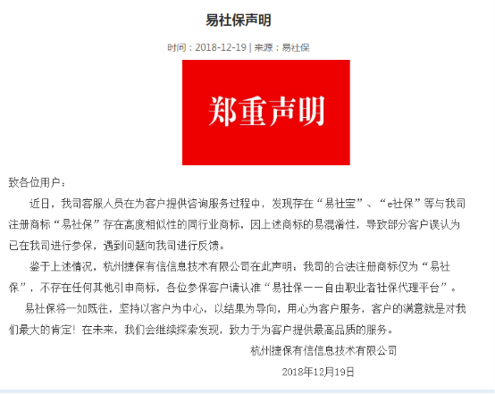 鉴于上述情况,杭州捷保有信信息技术有限公司在此声明:我司的合法注册商标仅为“易社保”,不存在任何其他引申商标,各位参保客户请认准“易社保——自由职业者社保代理平台”。