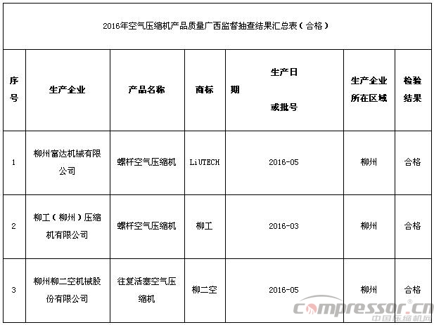 ?????? 9月9日,广西壮族自治区质量技术监督局官网通报了2016年空气压缩机产品质量广西监督抽查结果,共抽取广西区内3家企业生产的3批次产品,不合格产品检出率0%。