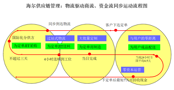 海尔集团对组织机构和业务流程进行了调整,把原来各事业部的业务全部分离出来,整合成商流推进本部、物流推进本部、资金流推进本部,实行全集团统一营销、结算。整合后,海尔集团商流本部和海外推进本部负责搭建全球的营销网络,商流本部、海外推进本部从全球营销网络获得的定单形成定单信息流,传递到本部、事业部和物流本部,物流本部按照定单安排配送,事业部组织安排生产;生产的通过物流的配送系统送到用户手中,而用户的货款也通过资金流依次传递到商流、本部、物流和分供方手中。这样就形成横向网络化的同步的业务流程。
